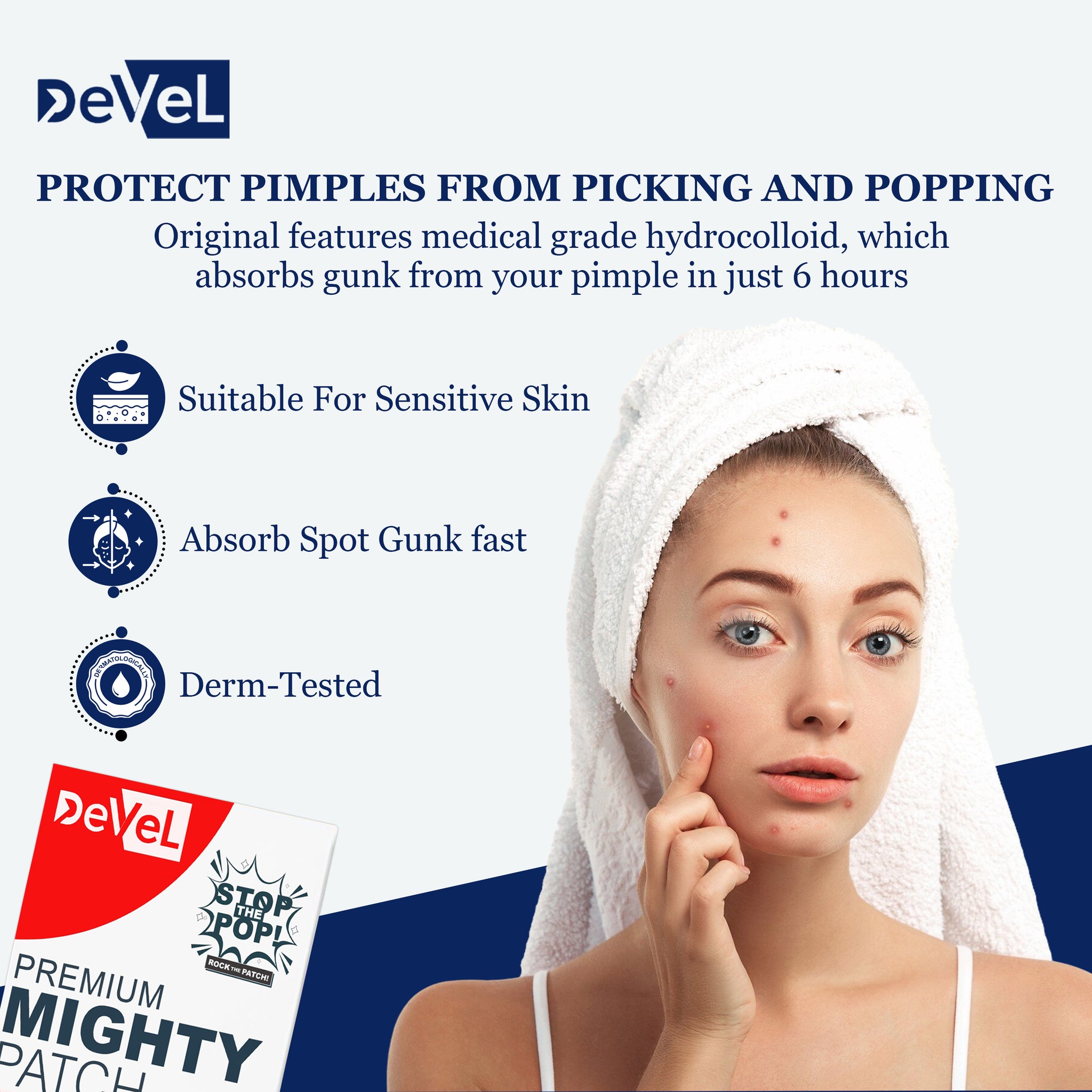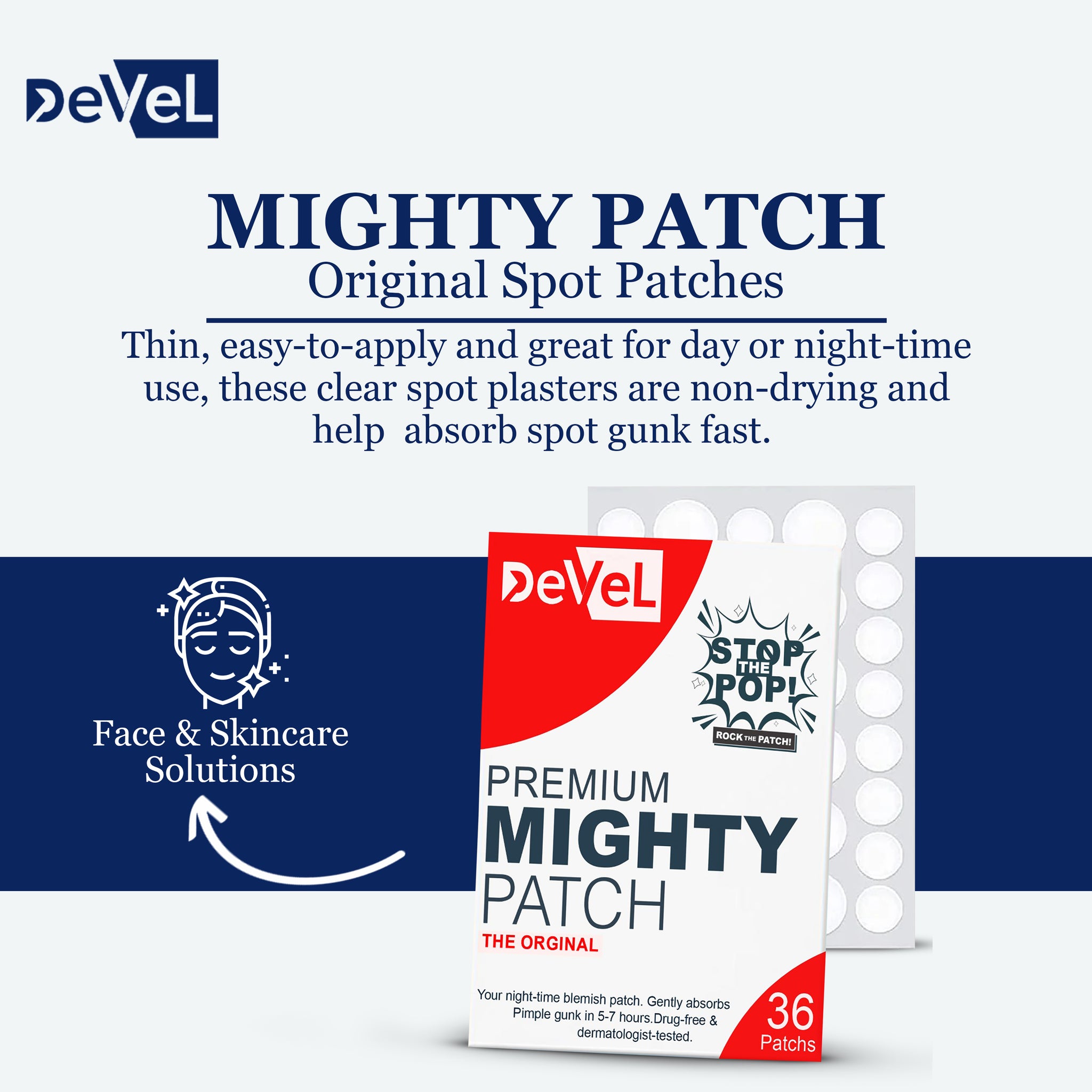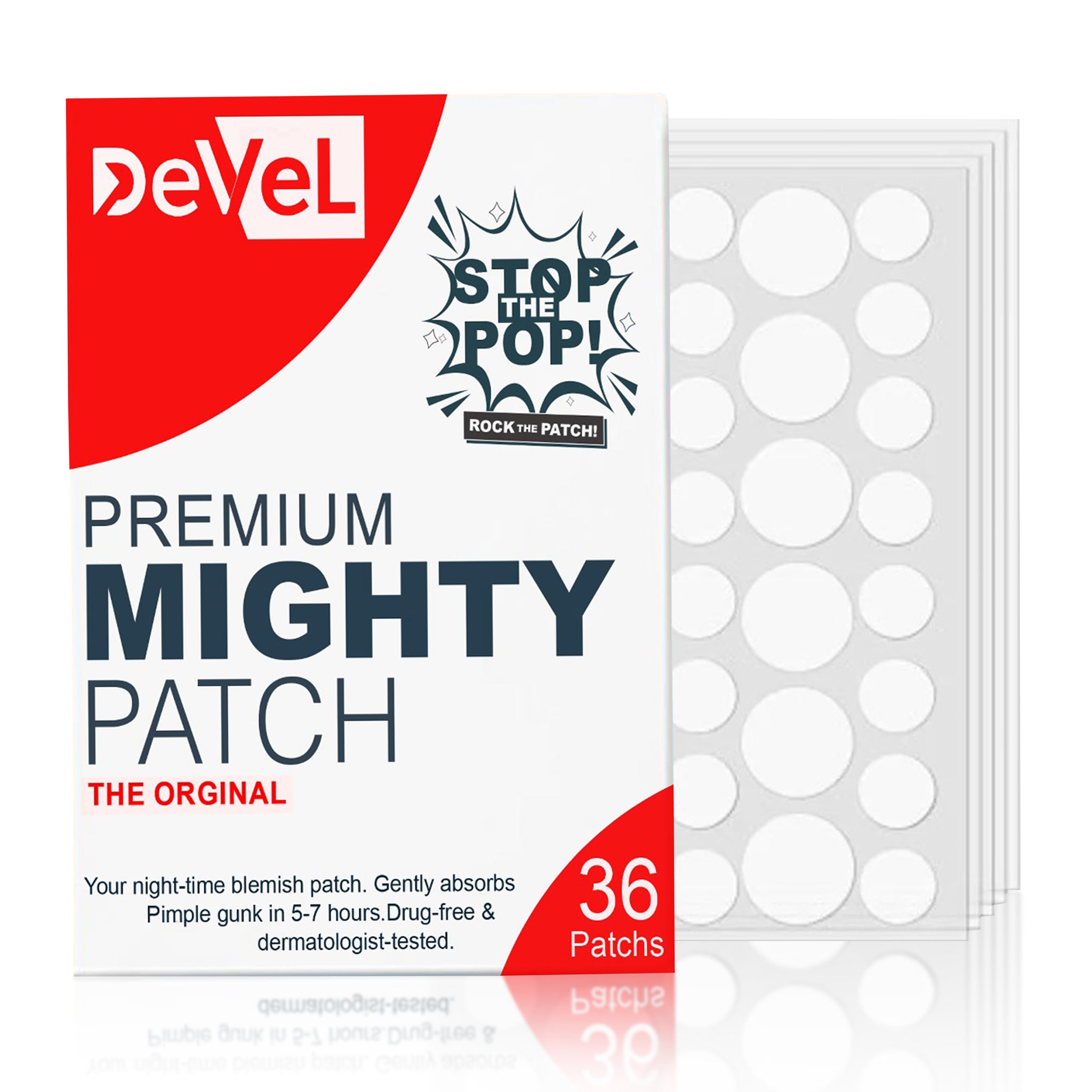 Product Description: DEVEL-Mighty Patch Original Spot Patches are your new blemish. Thin, easy-to-apply and great for day or night-time use, these clear spot plasters are non-drying and help absorb spot gunk fast. Plus, they’re protective to prevent picking and help promote healing. The translucent pimple stickers are super-thin hydrocolloid plasters that are barely noticeable. Easy to use, these light-weight patches feature a strong yet gentle glue which won’t budge - no matter how much you toss and turn in bed. Box of 36 patches. Each pimple patch protects, camouflages and helps encourage healing.